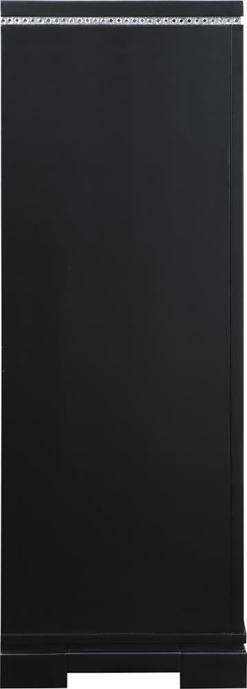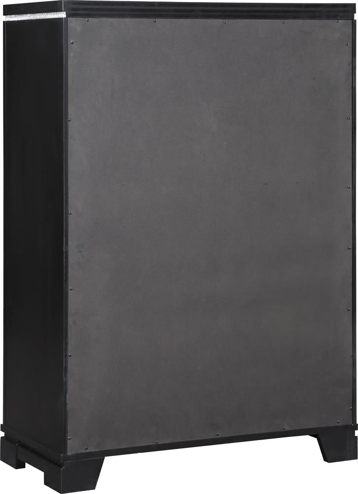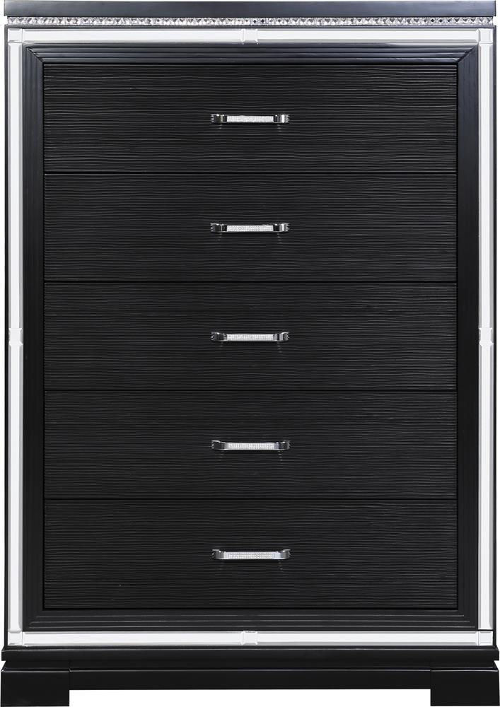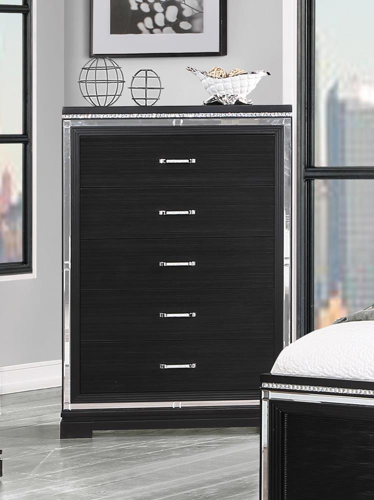 Dramatic and contrasting, this glam five-drawer chest offers a luxe look while offering up floor space with its tall, stacked design. Spacious drawers outlined in a polished mirror trim and a wood grain texture elevate the black finish frame. Each drawer mirrors the tile with their diamond-like encrusted handles and slim silhouettes. This stately chest of drawers also lends a bold look with its deep black finish, making the accents pop within a dramatic bedroom. This chest also features modern touches like a felt-lined top drawer where you can keep valuable delicates and other keepsake items.