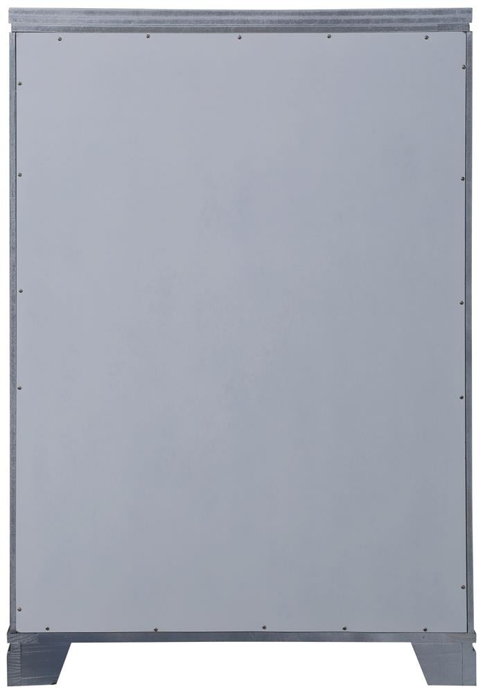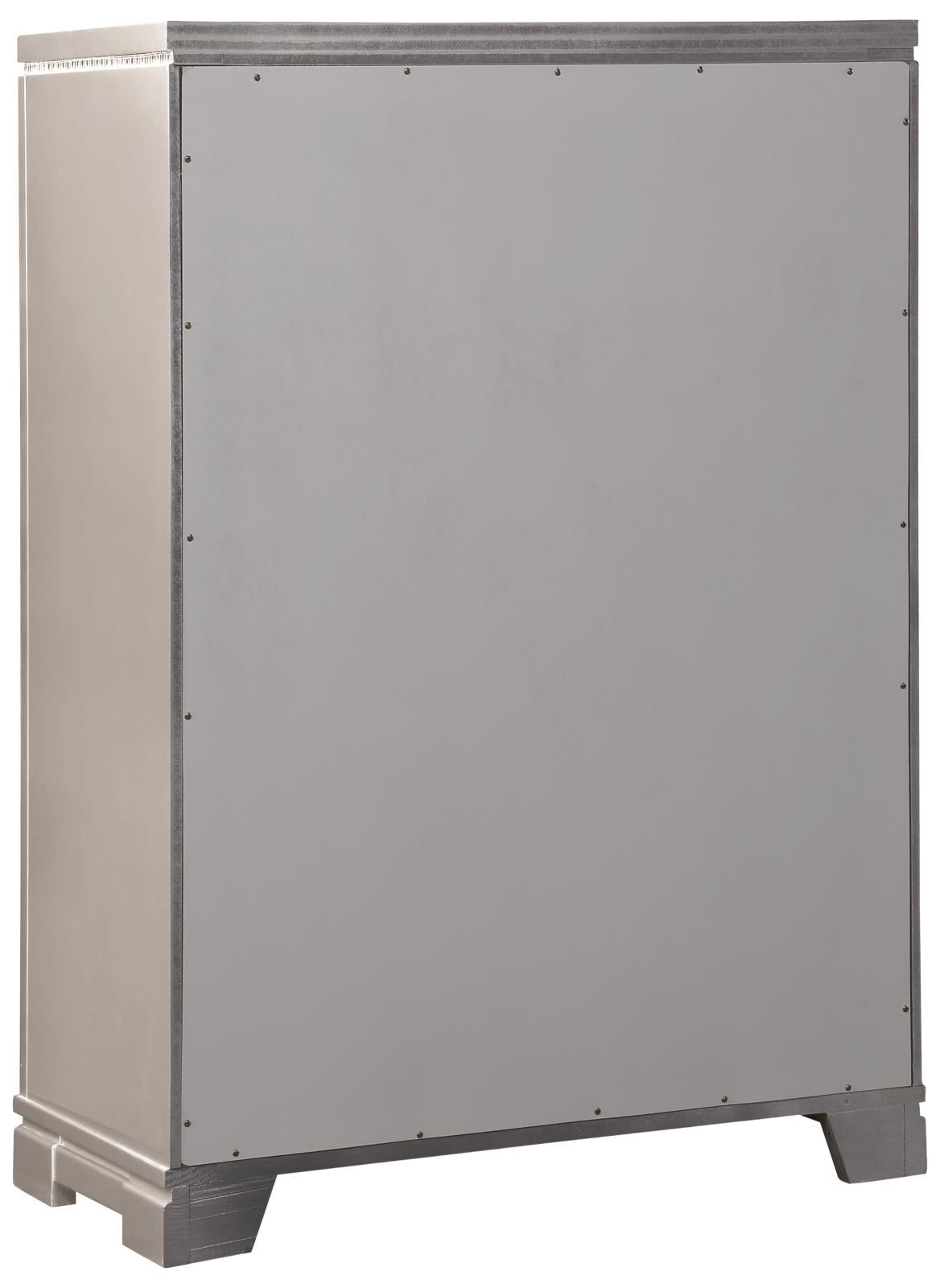 Create a luxe look to a contemporary bedroom with this stunning, glam five-drawer chest. The stack of spacious drawers showcases a dual crocodile and diamond embossed surface, adorned with glimmering crystal-encrusted hardware. Surrounded the set of drawers is a tiered wood trim molding, flanked by a mirror trim and tile accent to create a polished look. As part of the Eleanor bedroom set, this chest of drawers also boasts a clean, bright finish that works with many colors. Thoughtful and compact, this chest also comes with a felt-lined top drawer to keep delicate garments and accessories, and can free up floor space in a tight bedroom.