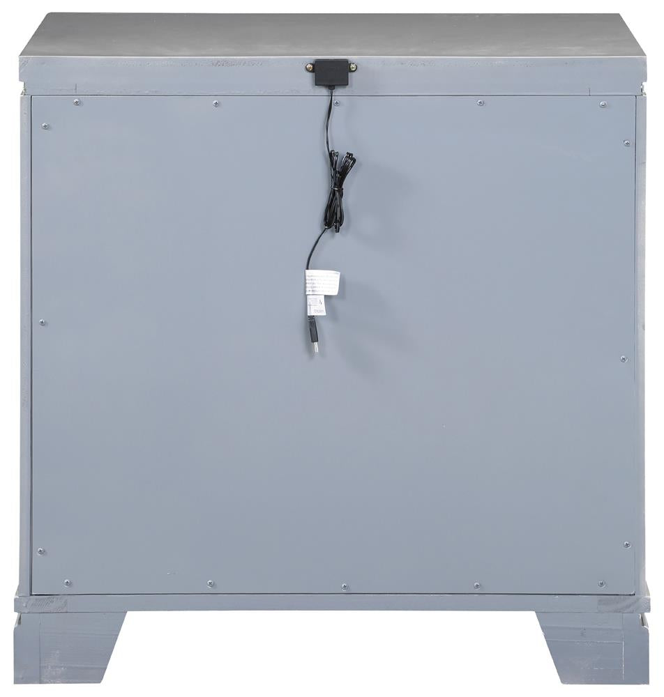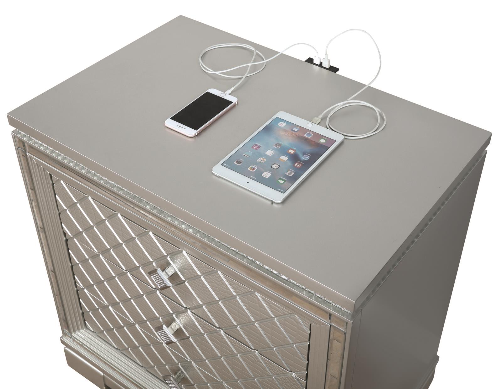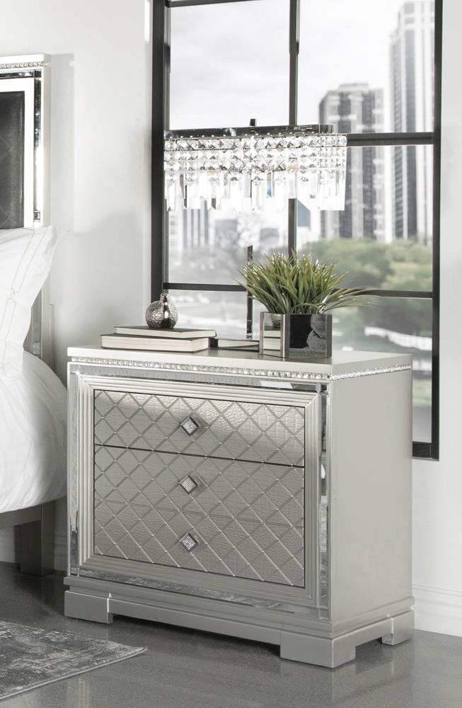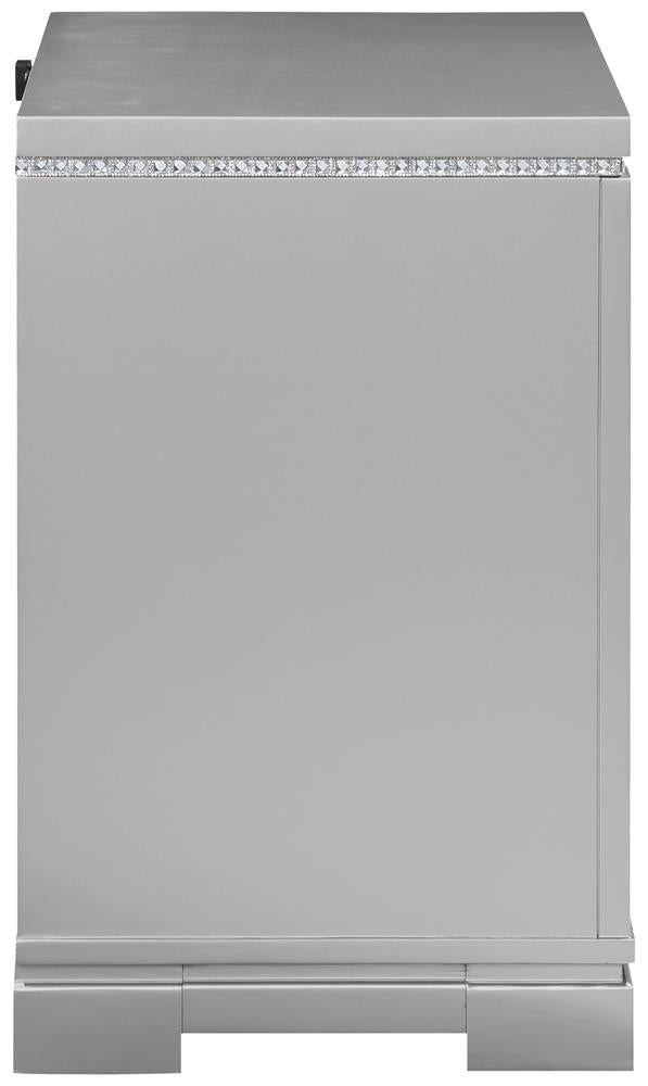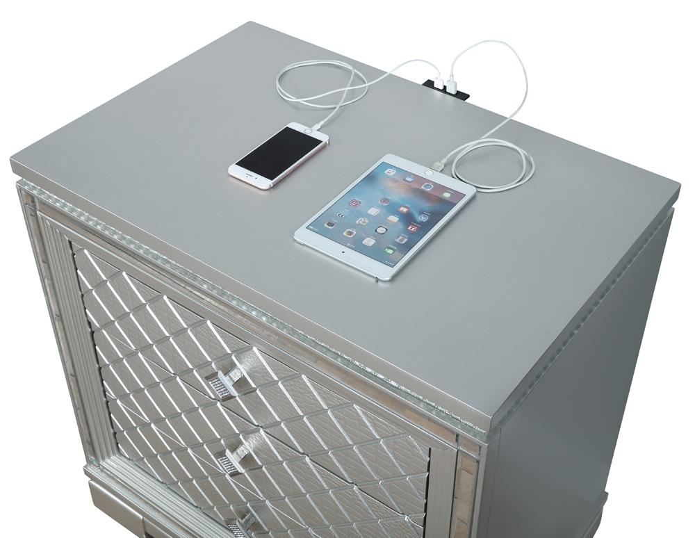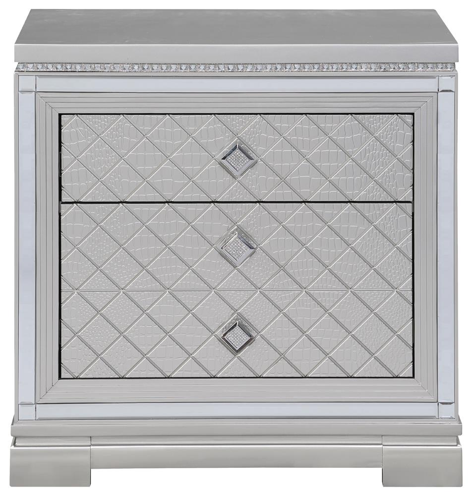 Clean lines and luxe details shine through in this two-drawer nightstand from the Eleanor bedroom set. Sparkling accents like a reflective mirror trim outlining the set of drawers and square knobs encrusted with diamond-like accents create a regal display against a bed. This glam nightstand opens itself up to whatever color palette you prefer and offers hidden extras like USB charging ports and a felt-lined top drawer for delicate accessories and jewelry. Lending to the understated white finish is textured drawer fronts embossed in a wild crocodile and diamond pattern. Along the top just below the tabletop surface is a slim crystal-like molding that completes the piece and mirrors the hardware.