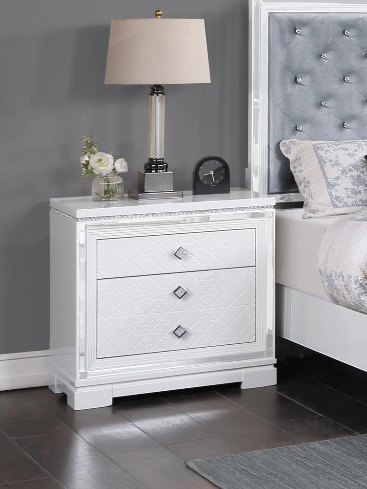 Clean lines and luxe details shine through in this two-drawer nightstand from the Eleanor bedroom set. Sparkling accents like a reflective mirror trim outlining the set of drawers and square knobs encrusted with diamond-like accents create a regal display against a bed. This glam nightstand opens itself up to whatever color palette you prefer and offers hidden extras like USB charging ports and a felt-lined top drawer for delicate accessories and jewelry. Lending to the understated white finish is textured drawer fronts embossed in a wild crocodile and diamond pattern. Along the top just below the tabletop surface is a slim crystal-like molding that completes the piece and mirrors the hardware.