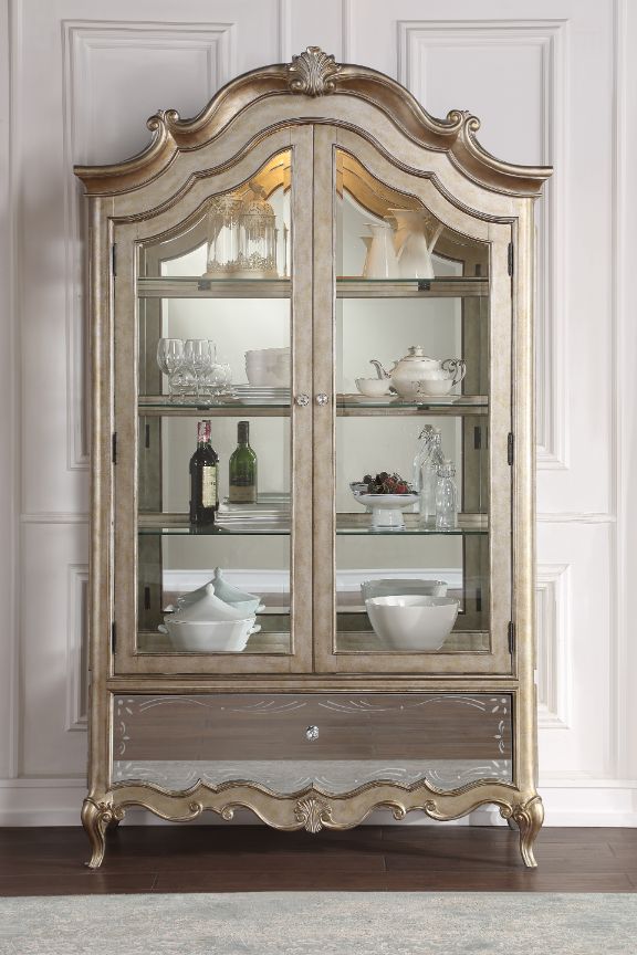 Every piece in the Esteban dining collection reflects vintage glam style! Gorgeous details such as raised scroll trim and crystal handles with mirrored fronts on the case pieces transform the entire collection into something extraordinary. The antique champagne finish and the mirror inlayed on the table top elevates this set to the height of luxury.