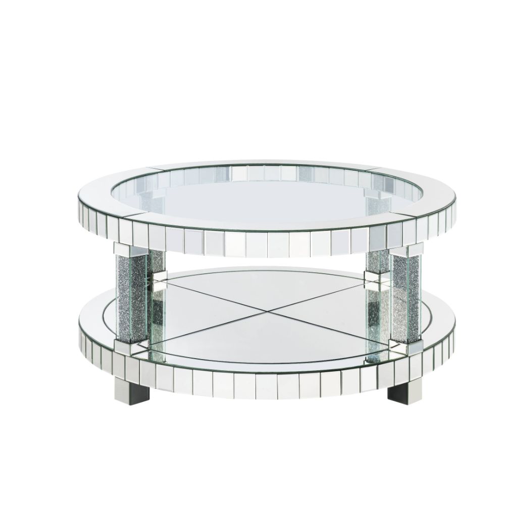 Assembled, Round Coffee Table Storage: Open Compartment Clear Tempered Glass Top Beveled Mirrored Frame & Shelf Base Square Leg with Faux Diamond Inlay & Tempered Clear Glass CONSTRUCTION] Glass TOP: 4mm Clear Beveled Mirrored Apron/Shelf: Mirror, MDF Mirrored LEG: Beveled Mirror, MDF, Acrylic Gemstones with Clear Glass (4mm)