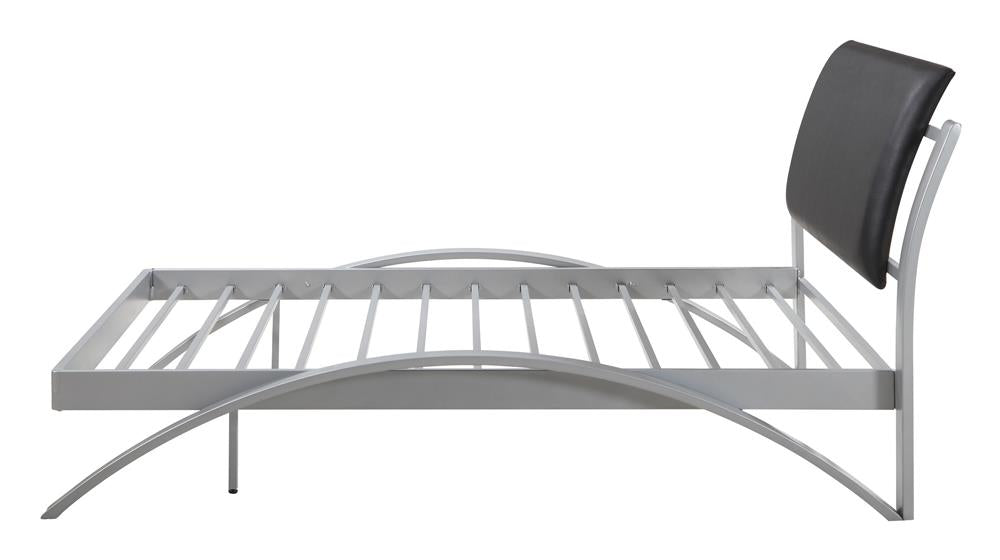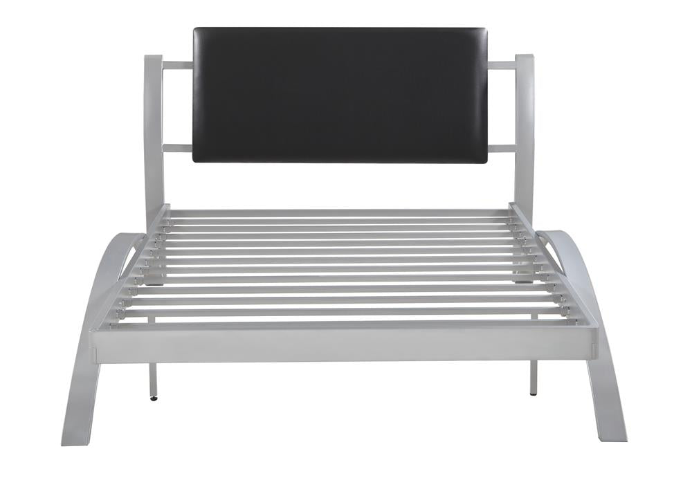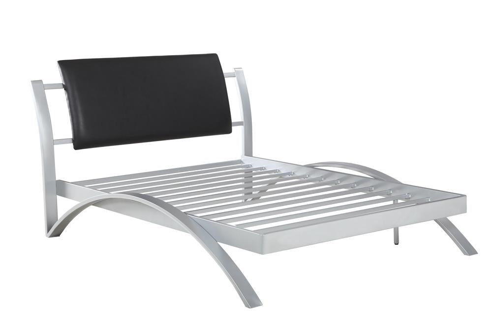 Elevate your bedroom decor with bold, modern appeal. This chic, full size bed frame blends elements of industrial and contemporary style to create a striking look. Its black leatherette headboard is a pleasing contrast to the cool, silver finish of its frame. Sleek, curved metal legs give it an unexpected touch of charm. With its stylish design, this frame is sure to enhance the aesthetic of any bedroom.