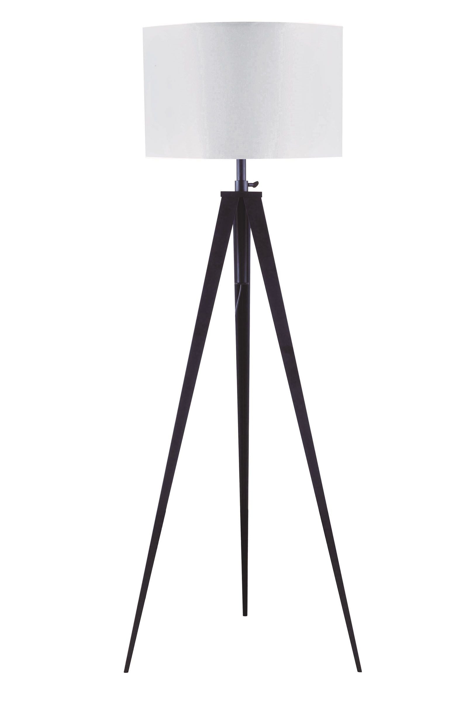 KD, Floor Lamp Features: Tri-Pod Lamp with Adjustable Height Light Bulb Required Type: E26 100W Type A or 23W CFL x 1Pc (NOT Included) Switch Type: 3-Way Rotary on Lamp Base Drum Shade: White Fabric Tri-pod Metal Base: Black Matte Finish