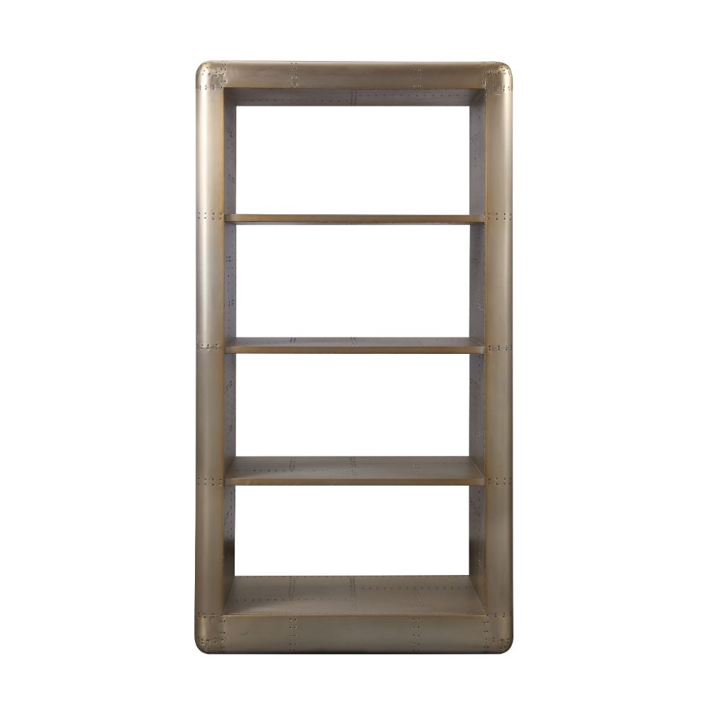 Assembled, Rectangular Bookcase Storage: 4 Open Compartments (3 Fixed Shelves/Open Back) Orientation: Freestanding (Wall) Patchwork Gold Aluminum Frame CONSTRUCTION Metal Case-Frame & Shelves: Patchwork Gold Aluminum, Ply NO Legs Shelf Size: 1" Thick (23mm)