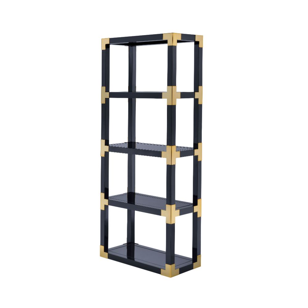 The Lafly open bookcase finished in a trendy black with gold corner accents frame. Use this to keep books, picture frames, and other mementos. Features five spacious black mirror glass shelves for storage and display. This bookcase is perfect fit for any room in your home. Some assembly required.