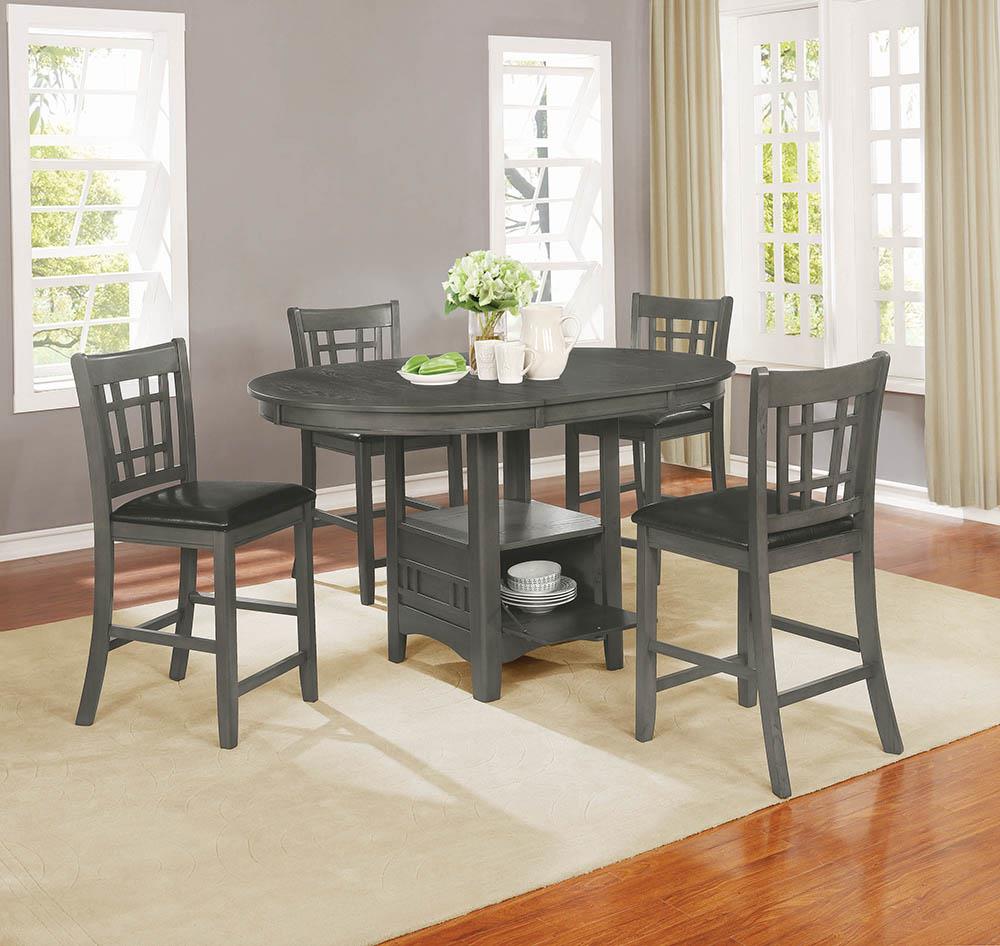 Embrace the versatility of transitional style and a chic finish. This counter height dining chair is a charming addition. A window pane-inspired seat back features vertical and horizontal slats that adds depth and detail to any decor. Each chair is meticulously crafted from Asian hardwoods and features a stylish medium grey finish. A beautiful addition to a dining room or breakfast nook, the chair offers a comfortable seat wrapped in back faux leather upholstery to accent a clean look and feel.