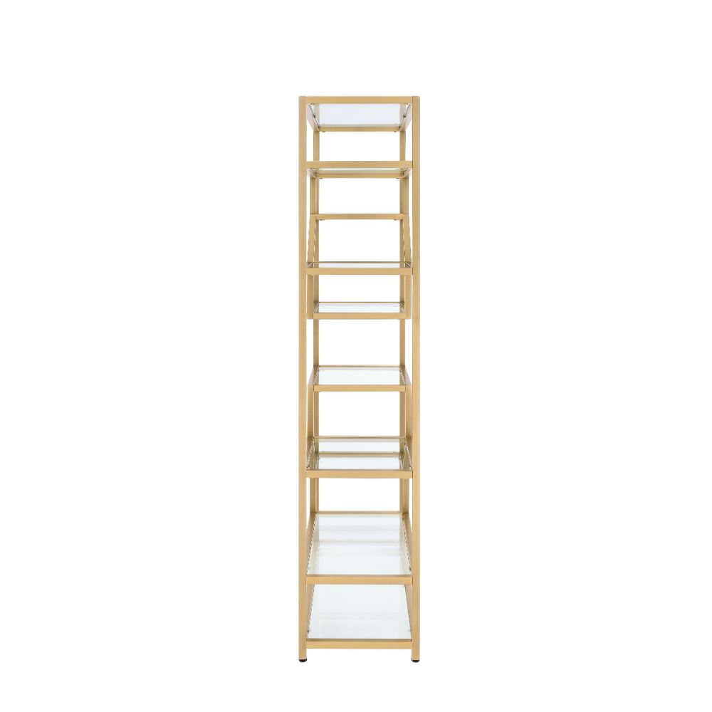 KD, Rectangular Cube Bookshelf 10 Fixed Glass Shelves (Staggered in Different Sizes) Metal Frame: Gold Finish (Open Back Panel) Shelves: 5mm Clear Tempered Glass