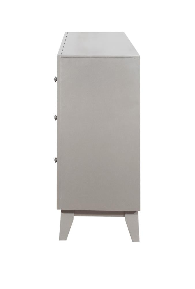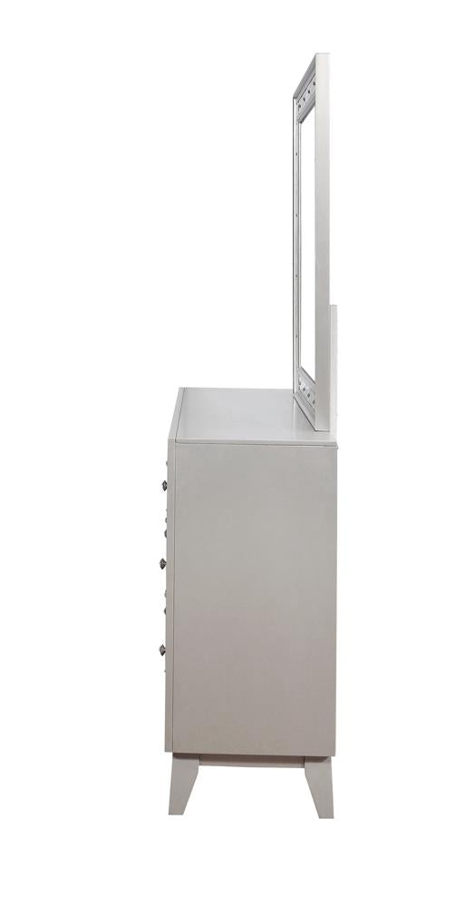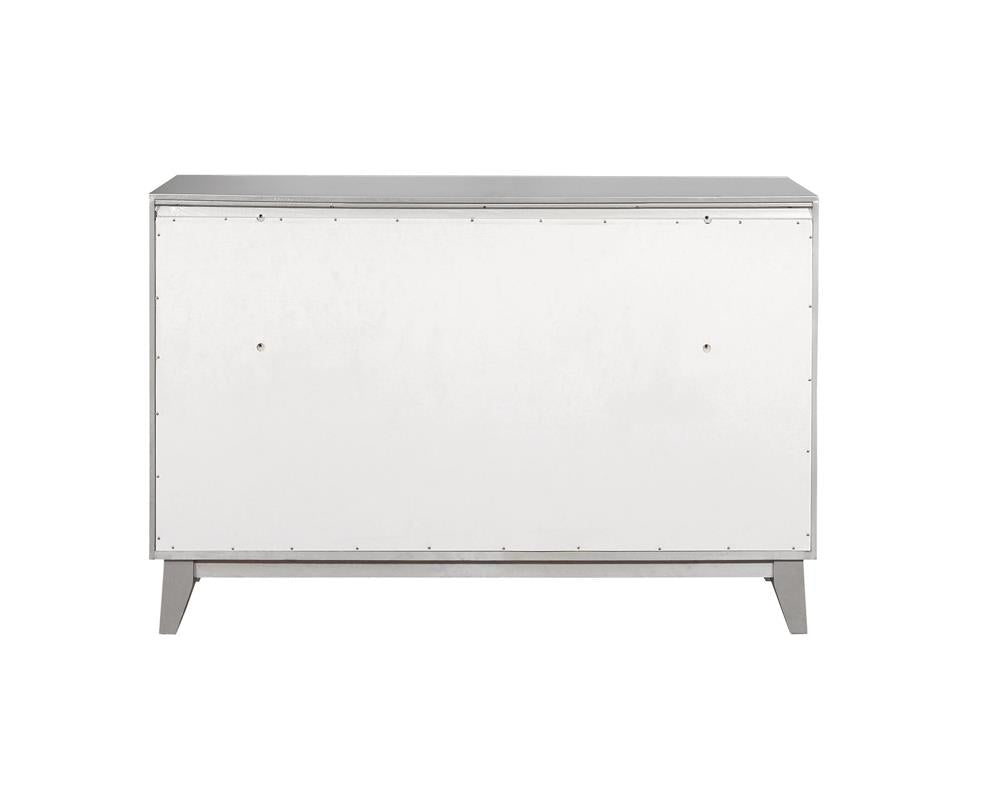 Chic and sparkly, this stunning dresser instantly dresses up a bedroom. A beautiful, metallic mercury finish gives it a lovely, polished look. Its front edges are enhanced by brilliant, reflective accents for a touch of dazzling shine. Spacious drawers allow plenty of space to store clothing and accessories. A Coaster exclusive, this dresser exudes transitional glamour.