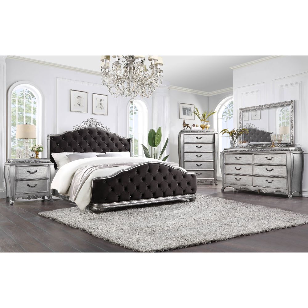 The Leonora bedroom collection brings opulence into your home, with elegant details such as raised scrolled-floral molding and cabriole legs. At the center of this collection is a padded bed, with winged, arched headboard and footboard, both bedecked with button tufting. Case pieces with bowed silhouettes emphasize Leonora's classic design.