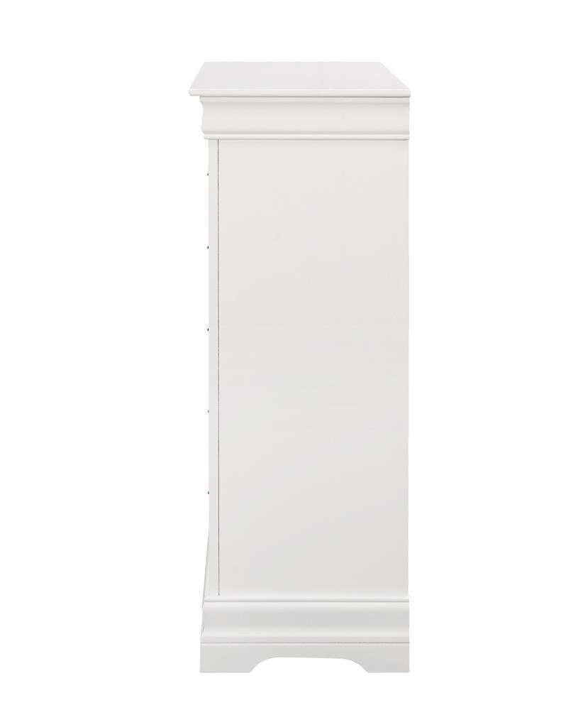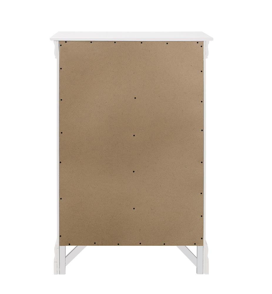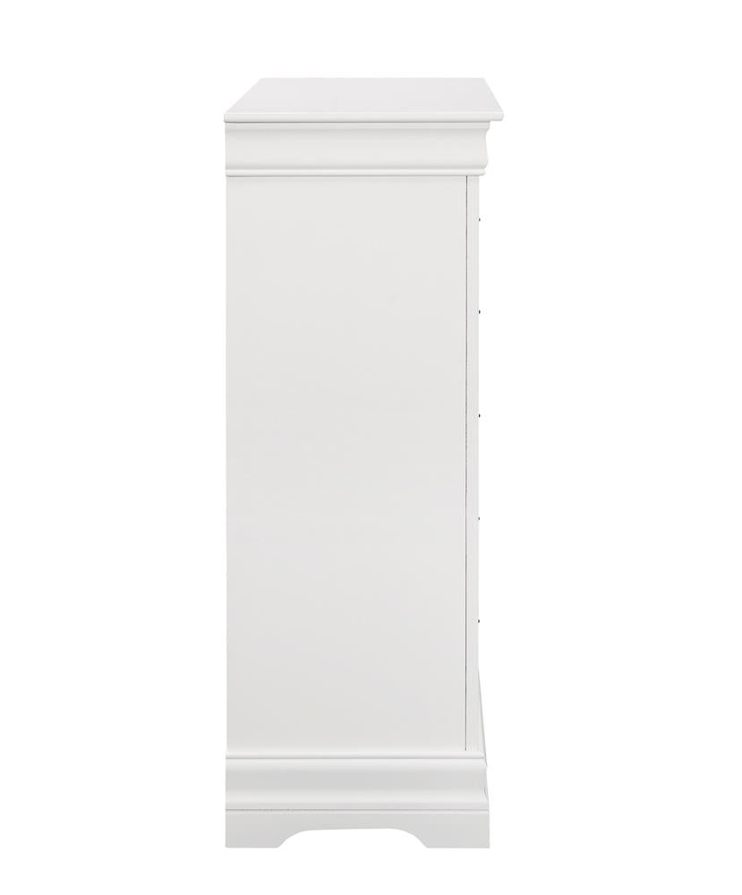 Store linens and papers in this stylish transitional five-drawer chest. Sleeken up a teenager's room with the crisp white finish. Small, metallic hardware in a deep color contrasts against the light wood, creating visual intrigue. Versatile and neutral, this chest works with a variety of decor schemes. Constructed of wood veneer and select hardwoods, the frame features long lines and thickly tapered legs.