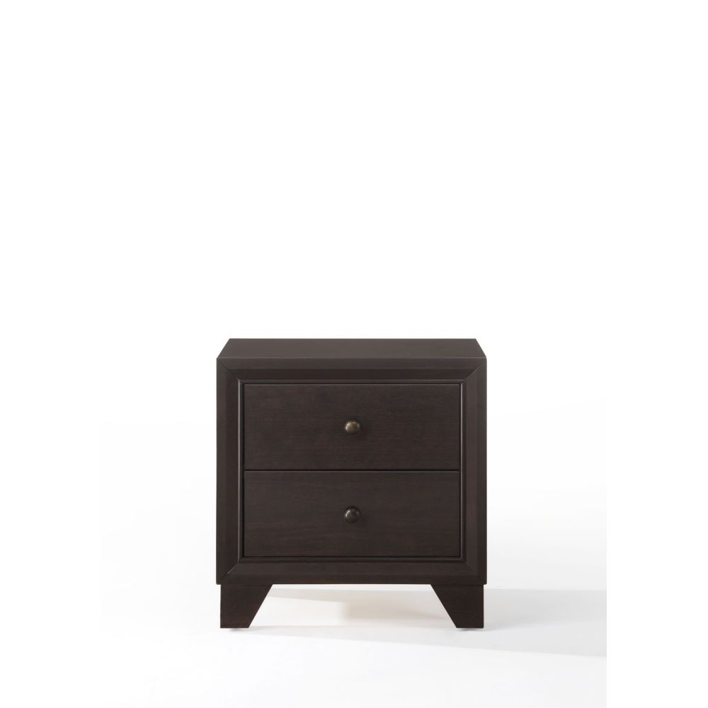 The Madison casual nightstand in espresso finish features two convenient drawers. All drawers have English dovetail with center metal glides. The elegant medium brown color and clean lines of this collection are both pleasing and subtle.
