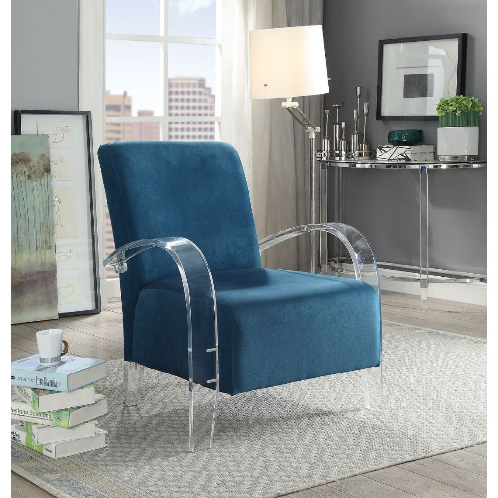KD, Arm Chair (High Backrest) Stationary Seat Padded Seat & Back: Teal Fabric Cushion Tight Seat & Back Cushion Curved Acrylic Armrest & Leg: Clear Acrylic Construction: Memory Foam 0.50" (10mm), Wooden Frame Material: Fabric (Solid Pattern), No Cushions
