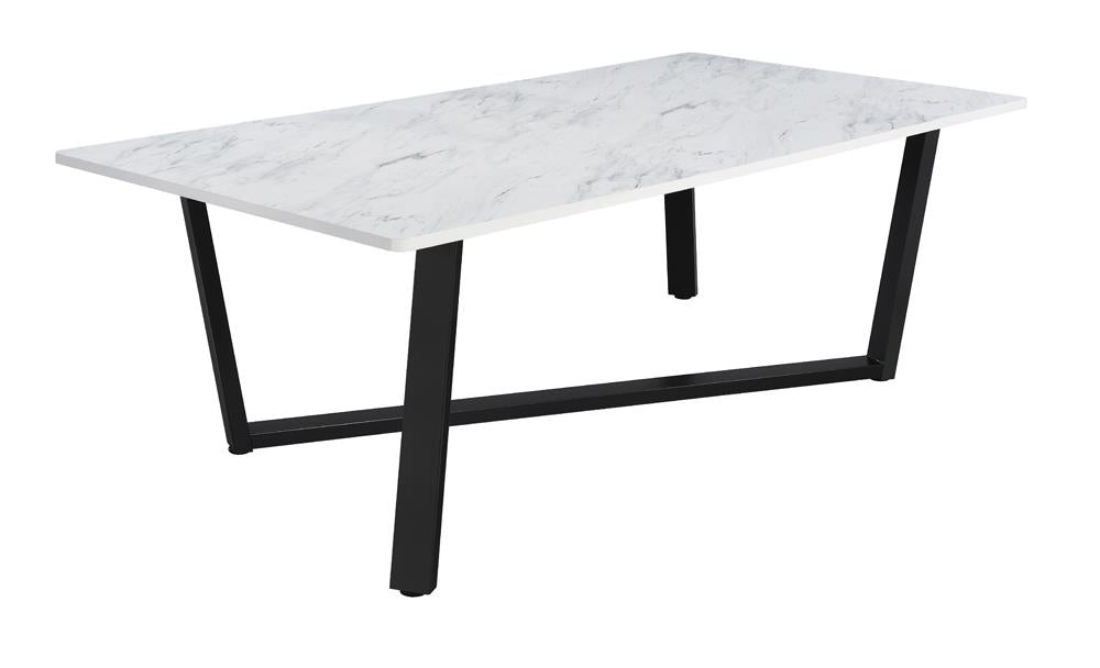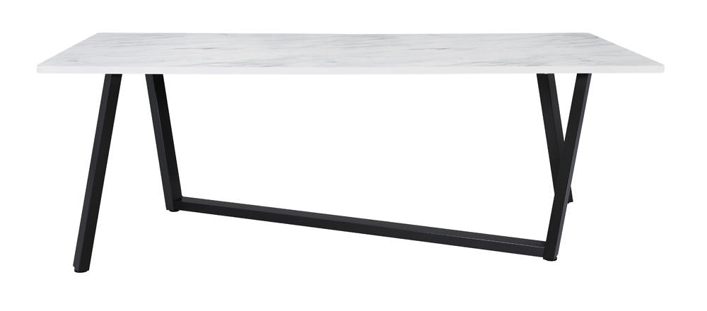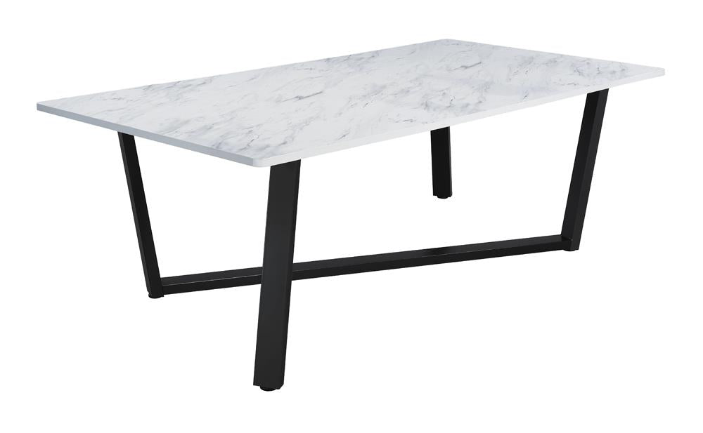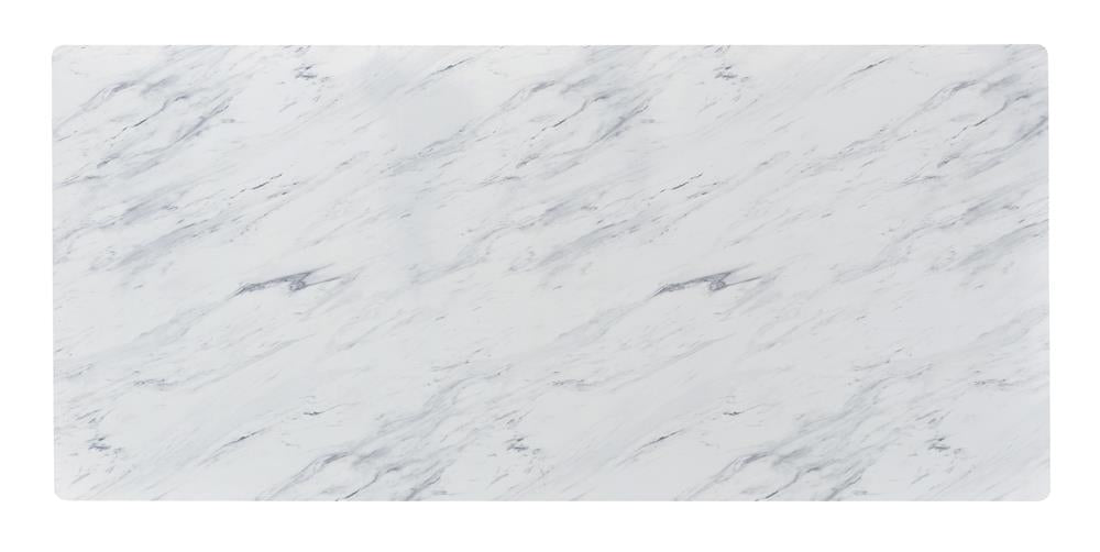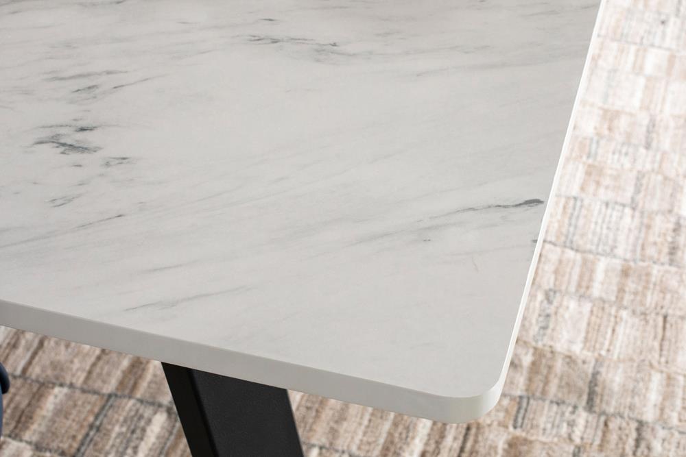 With a white marble-inspired tabletop design, this modern dining table creates a classical look to a space. Timeless traditional elements are contrasted by an asymmetrical metal base, featuring a singular diagonal trestle leg and two separate angled legs. The striking base offers a powder coated gunmetal finish for extra durability and resistance. The sleek and spacious tabletop offers seating for up to six guests too. Place this ultra-modern dining table in a formal dining area.