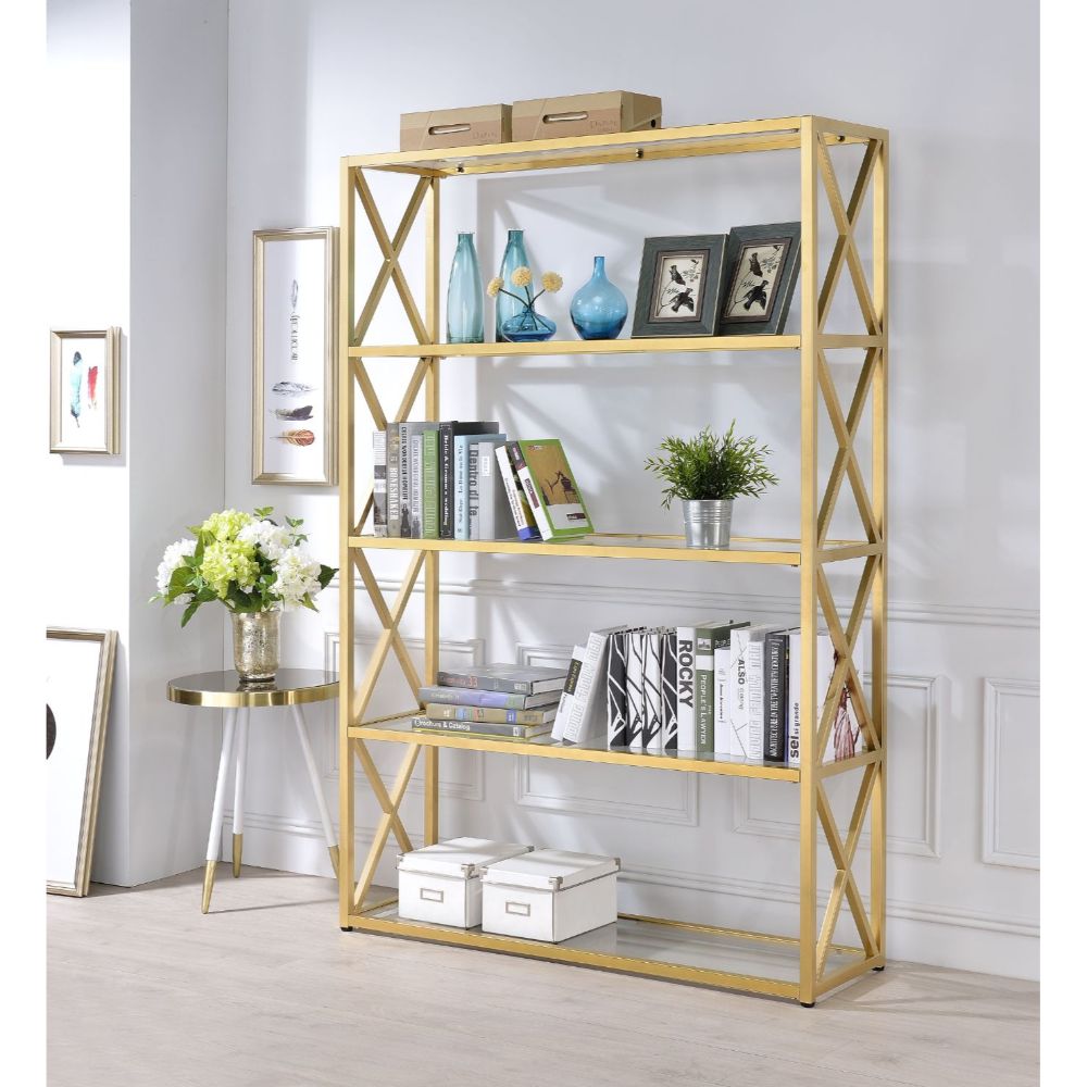 The Milavera open bookcase finished in a trendy gold, and X design on sides. Use this to keep books, picture frames, and other mementos. Features five spacious clear glass shelves for storage and display. This bookcase is perfect fit for any room in your home. Some assembly required.
