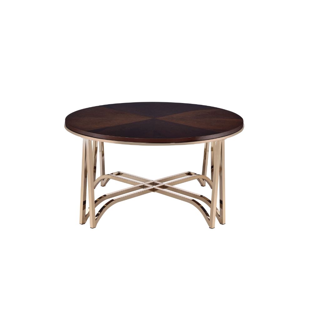 KD, Round Leg Coffee Table NO Storage (Open Base) Round Wood Top: Walnut Finish, Birch Parquet Wood Veneer, PB 18mm (Fixed Top/No Apron) Metal Leg & "X" Crossbar Support Frame: Champagne Finish, Metal Tube (13/26mm, 20/20mm)