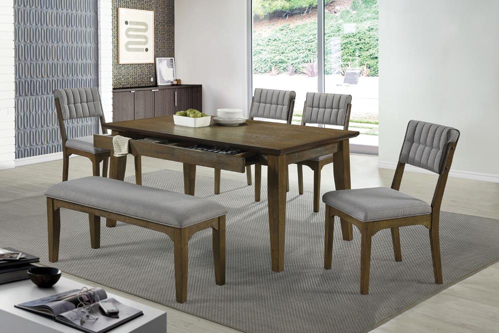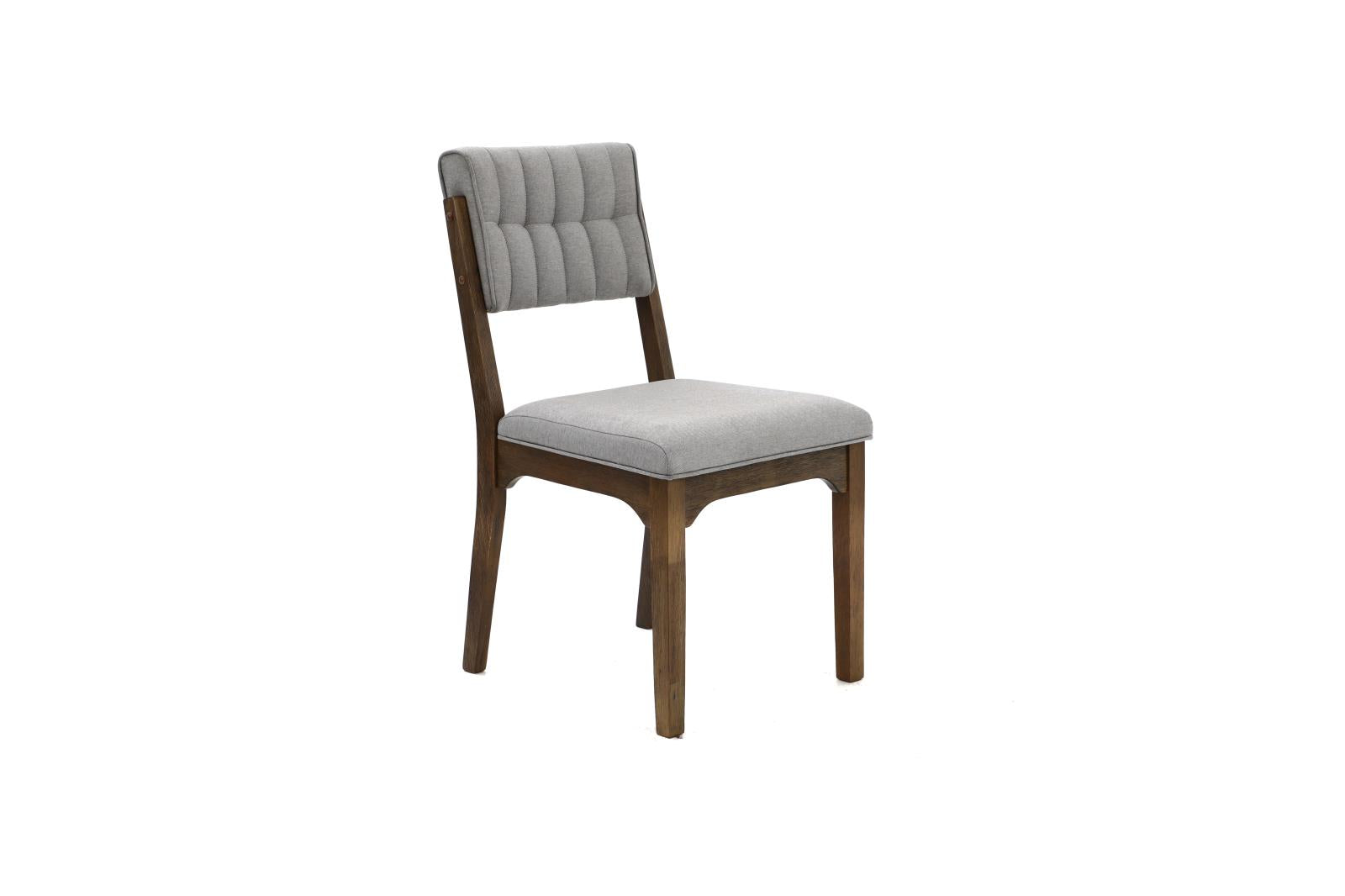 Pull up a pair of these retro-inspired chairs to a dining table for comfort all through dinner. Each chair is constructed of solid Asian hardwood for extra support and durability. The frame also features a medium brown finish that complements numerous color palettes and offers an earthy, rustic flair. A padded seat and padded backrest are wrapped in a grey fabric lined in welt trimming, and the padded back seat also offers understated tufting for a more vintage look. Within the same Rayleene collection is a matching dining table and bench, as well as counter height options in the same style.