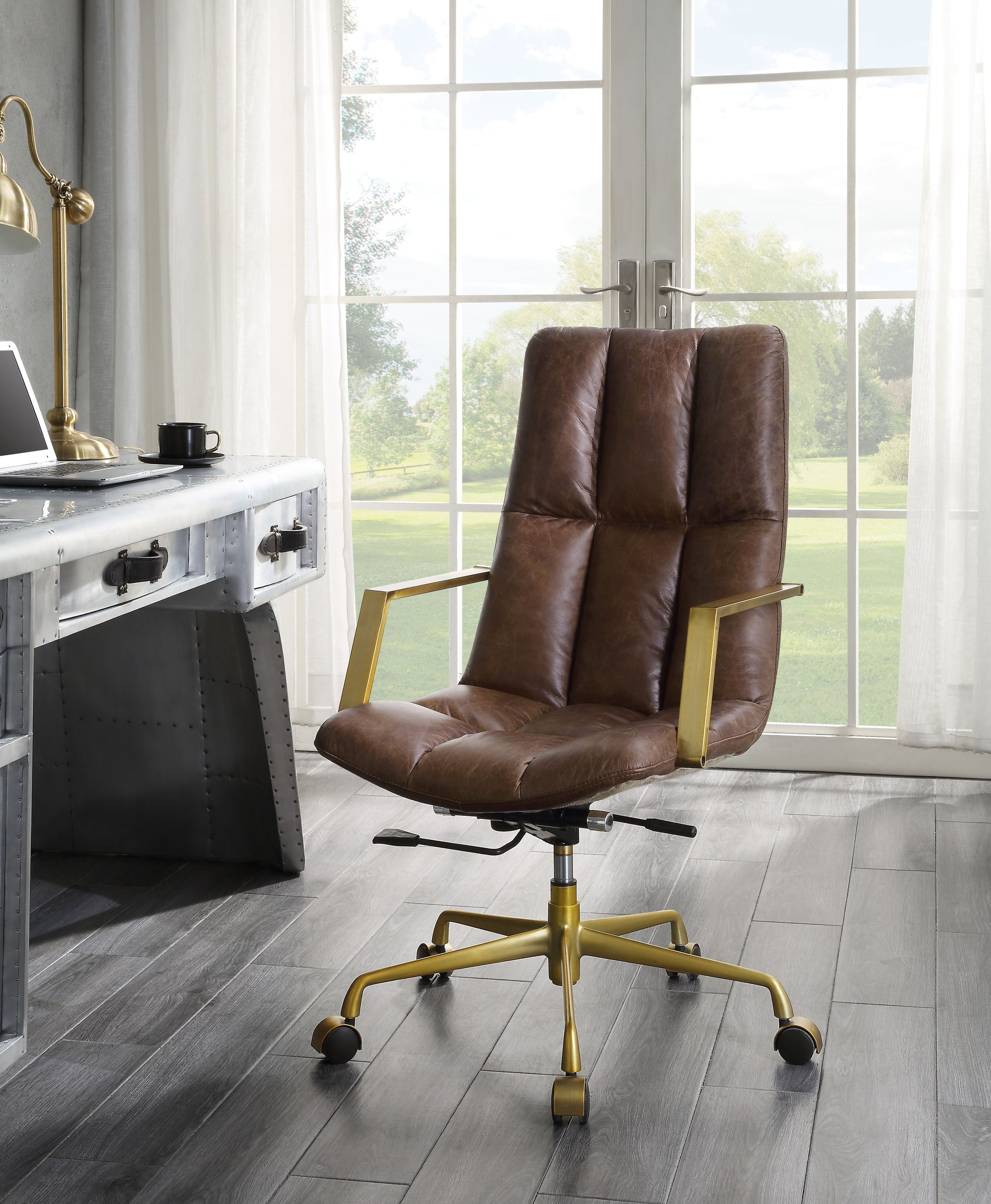 KD, Executive Office Chair Seat: w/Swivel (), Adjustable Height (Pneumatic 3-Inch Lift) Padded Seat & Back: Top Grain Leather () Backrest: Upholstered (tm) Armrest Metal Base Frame 5-Star Base w/Casters