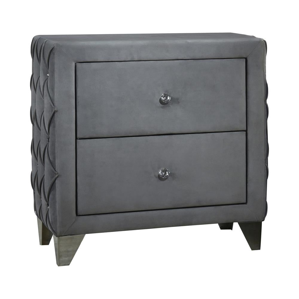 This eye-catching upholstered nightstand showcases accents and style fit for modern sophistication. It features Asian hardwood, plywood, and MDF construction designed for years of enjoyment. Two drawers have full extension glides for ease of movement. Sides of nightstand are wrapped in soft grey velvet upholstery and faux crystal rhinestone button tufting for dramatic flair. This lovely nightstand will hold its own in any well-appointed bedroom.