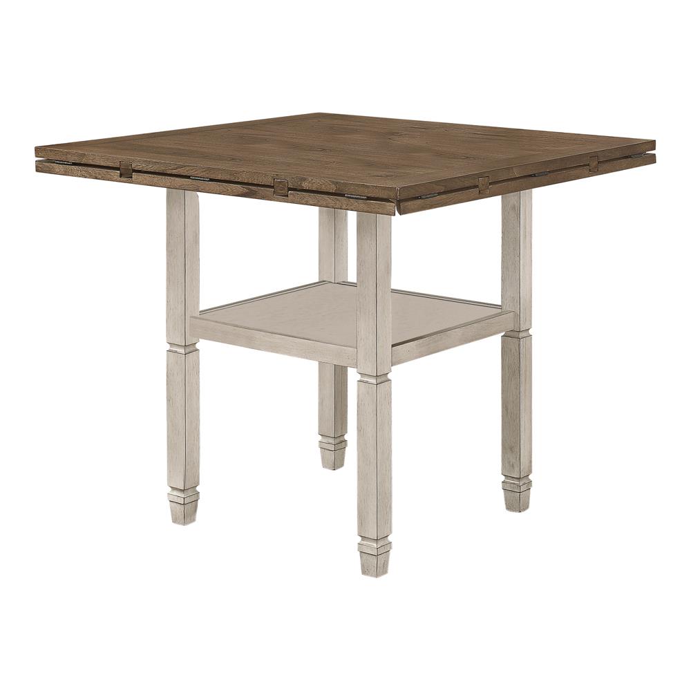 Uniquely fashionable and supremely functional, this counter height dining table has it all. Perfect for spontaneously switching up your style, the square tabletop features four drop down leaves to convert it to a round shape. An open shelf is built into the base for the added convenience of storage space. A two-tone finish of nutmeg and rustic cream adds elegant dimension to this eye-catching piece. Complete with square, turned legs, this charming table puts a creative spin on a classic country design.