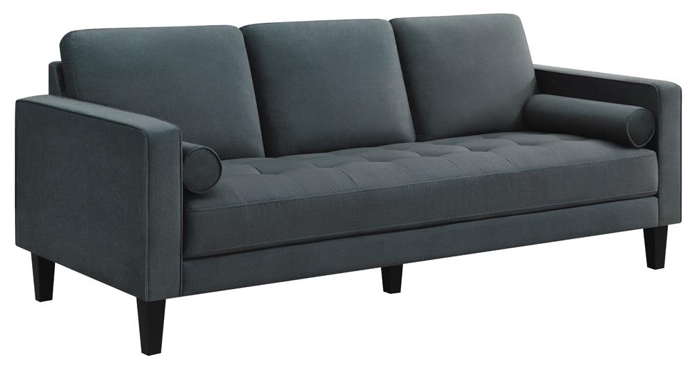 Wrapped in a navy blue woven fabric, this loveseat lends a charm to any room. Elegant with a mid-century modern style, the silhouette offers a gently sloped and slightly flared, tapered arms. This retro-inspired loveseat lends a vintage look, complete with channel tufted back cushions. Tapered wood legs made of sturdy, solid hardwood offer extra stability and support, as well as extra flare to the retro look. Each leg is finished in a dark brown tone that completes the modern vibe.